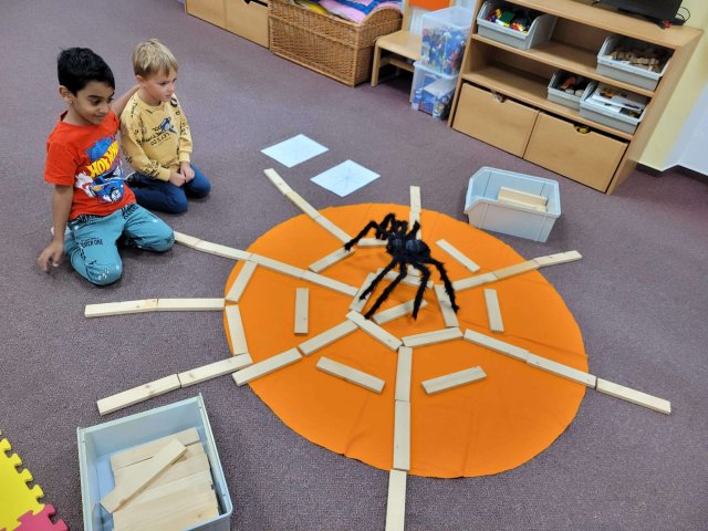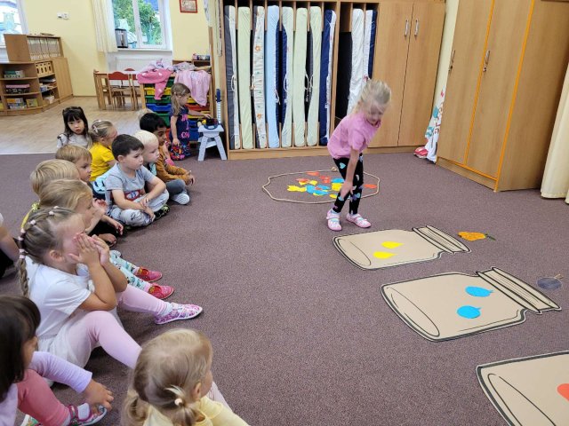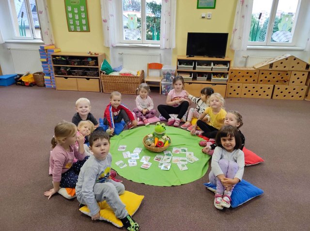 Povídali jsme si o jablíčkách, která rostou na zahrádce a poznávali i ostatní druhy ovoce, v dalším týdnu jsme zpívali písničky o zelenině jako ,,Cib, cib, cibulenka" a ,,Hop, hej, cibuláři jedou". Vyprávěli si pohádku ,,O veliké řepě", kterou si děti také zahrály. Poslední týden jsme sledovali změny, které se dějí na podzim s přírodou.