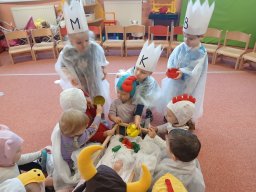 S dětmi jsme si připomněli legendu o mudrcích z východu, kteří se přišli do Betléma poklonit Ježíškovi. Společně jsme zpívali známou koledu - My tři králové jdeme k vám, dramatizovali příběh o
