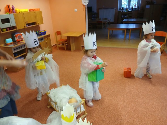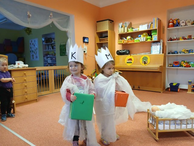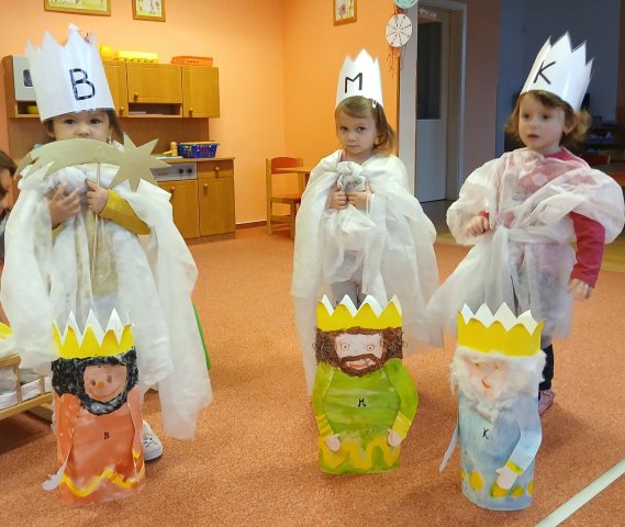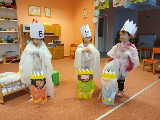 S dětmi jsme si připomněli legendu o mudrcích z východu, kteří se přišli do Betléma poklonit Ježíškovi. Společně jsme zpívali známou koledu - My tři králové jdeme k vám, dramatizovali příběh o