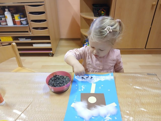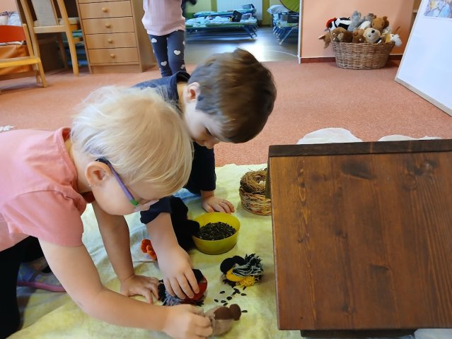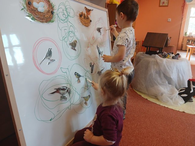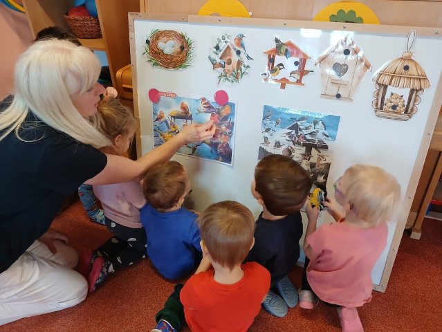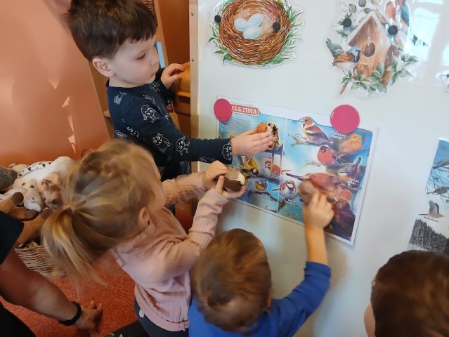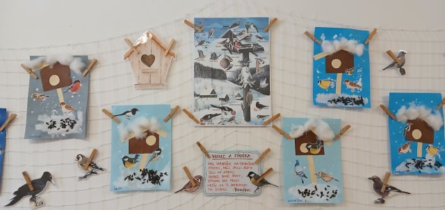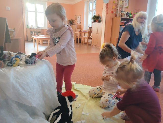 ťukat další ptáčci. Rázem měly děti ve třídě Vrabce domácího, Sýkorky, Hýla obecného, Kosa černého, Pěnkavu… Ptáčkům nasypaly zrníčka a ti pak dětem svým švitořivým hláskem vyprávěli, jak těžké je v zimě najít něco do zobáčku. Děti si s novými kamarády užívaly celý týden. Společně poznávaly, kteří ptáčci u nás přezimují, jak vypadají, jak zpívají a jak jim můžeme pomoci zimu přečkat. Nadšeně cvičily, zpívaly, tančily a hrály zábavné veselé hry.