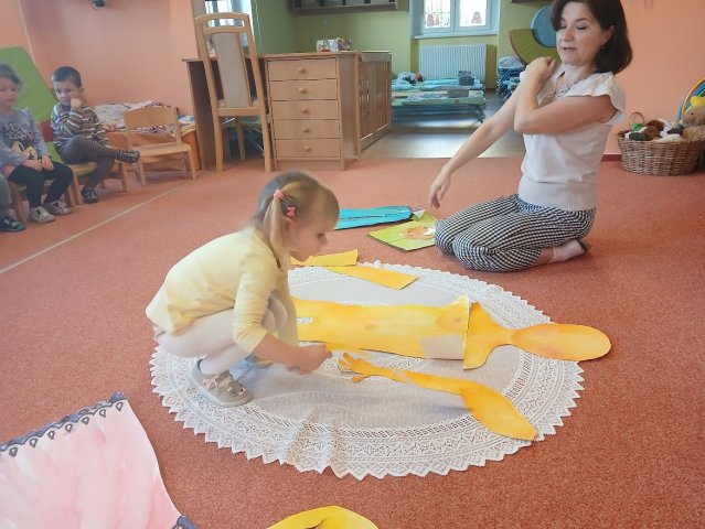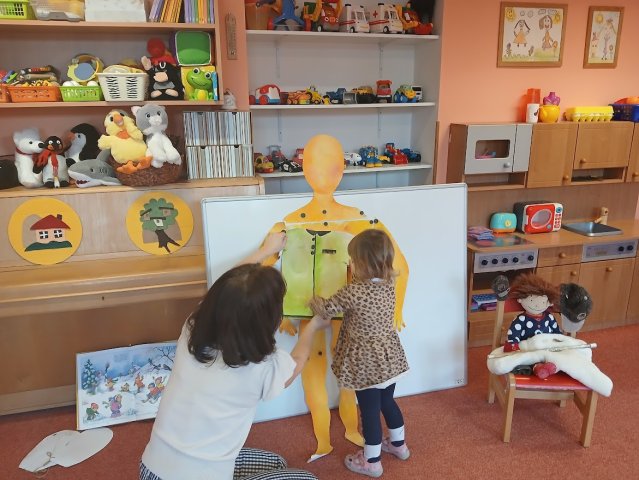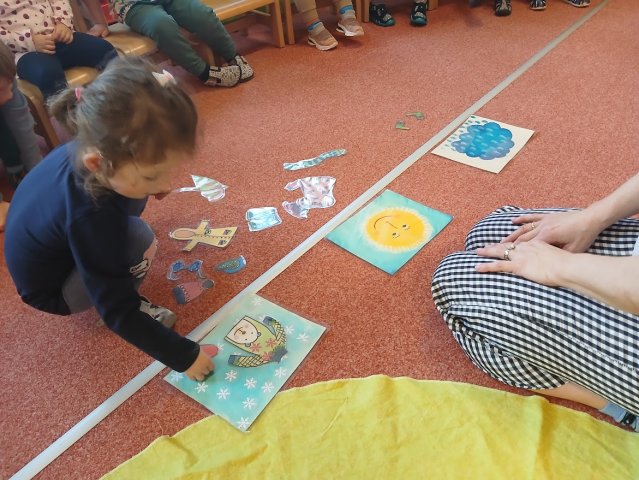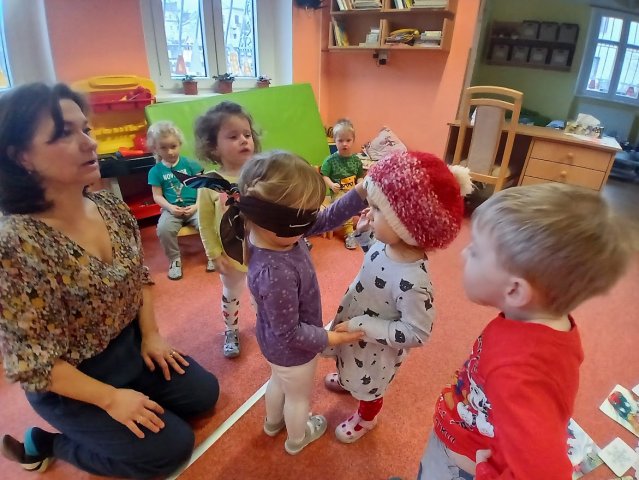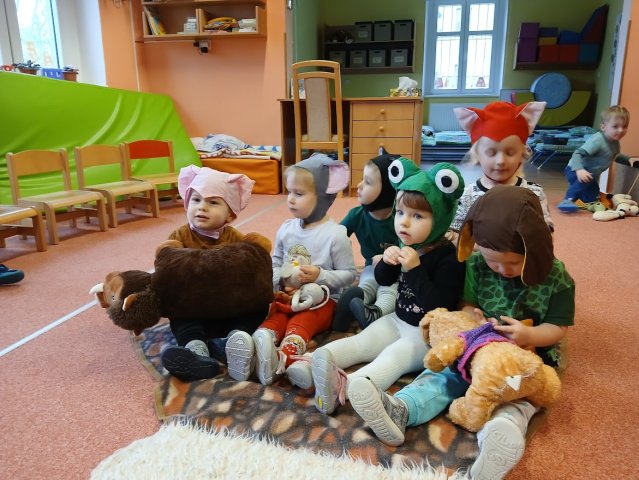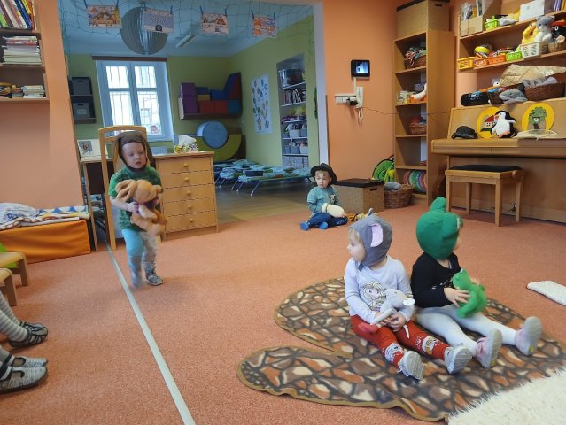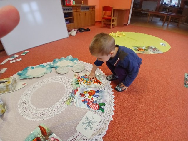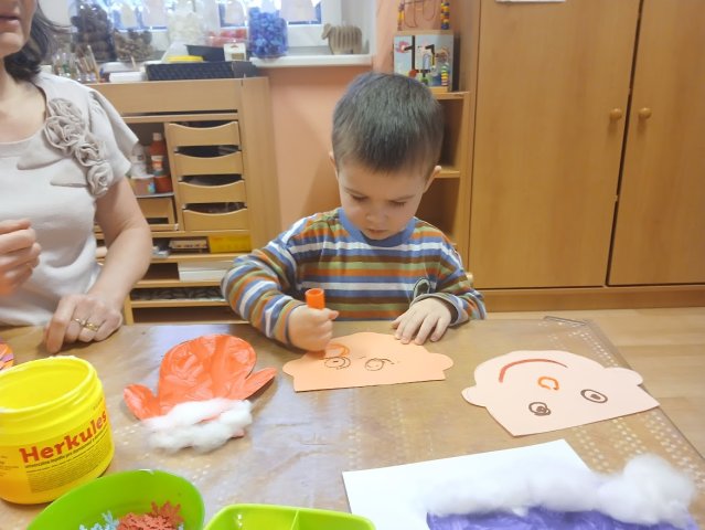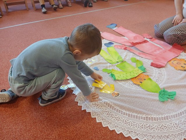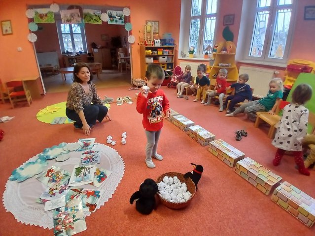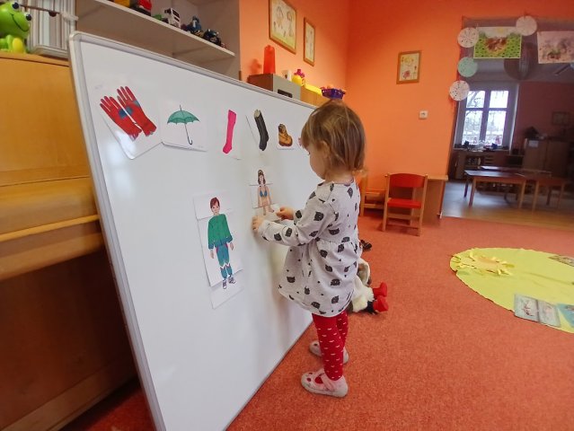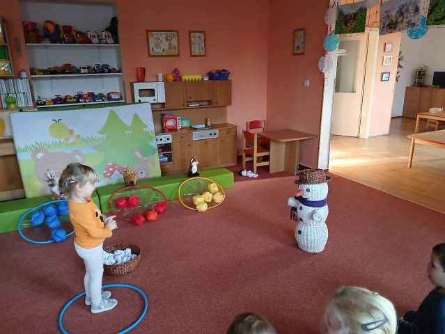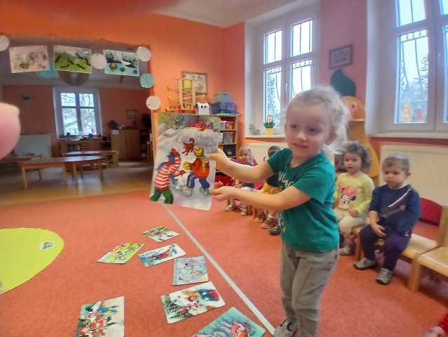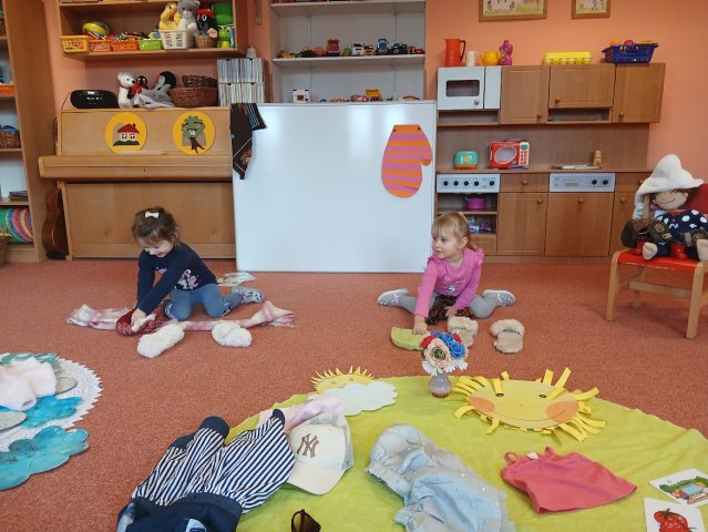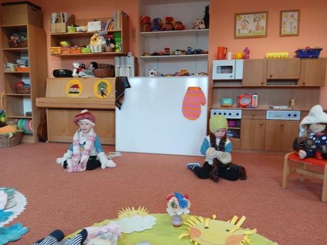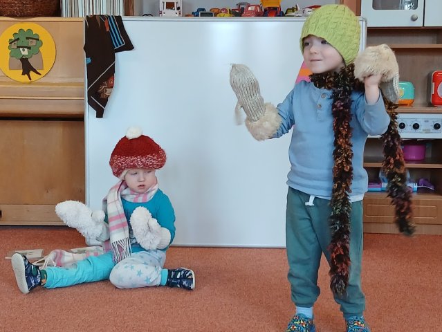 zábava. Děti zpívají, tančí, hledají ztracené rukavičky do páru a hrají krásné hry. S veselými říkankami se učí, jak správně se do zimy a mrazu oblékat, a některé oblečení si s nadšením tvoří a zdobí.