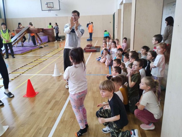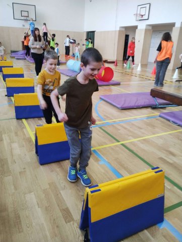 Základní škola U Lesa nás opět pozvala na akci „Sportovní den“, kde jsme část dopoledne strávili v jejich velké tělocvičně. Učitelé a žáci si pro nás připravili obrovskou překážkovou dráhu, která nám posílila celé tělo. Sportovali jsme na všem nářadí od kladiny po kozu. Házeli jsme míčem do koše, houpali se na laně, chodili po nakloněných lavičkách a přeskakovali větší i menší překážky. Na závěr jsme celí upocení, ale hrdí na výkon, dostali vyrobené medaile.